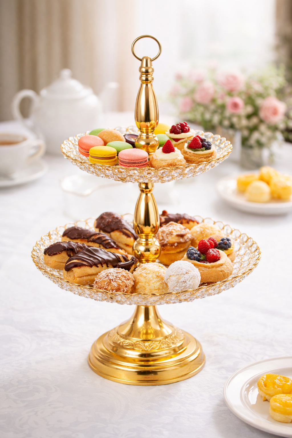 Structura pe două niveluri permite organizarea eficientă a fructelor sau deserturilor, economisind spațiu pe masă și oferind o prezentare elegantă. În același timp, designul luxos o transformă într-un element decorativ perfect pentru bucătărie, living sau masa festivă.
