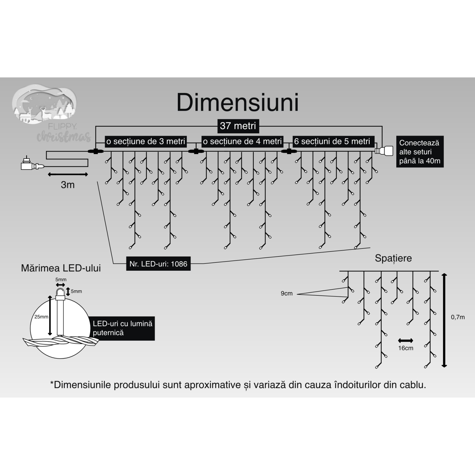 Suprafata luminoasa are un total de 37 m metri. Lungimea prelungitorului este de 3 m metri. Ofera posibilitatea de a suspenda ghirlanda astfel incat sa poata fi ascuns cablul de alimentare atunci cand este conectat la priza.