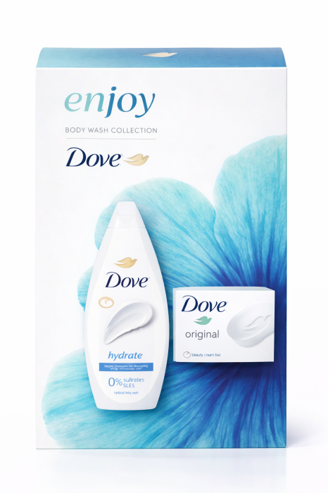 Răsfață-ți pielea cu hidratare și îngrijire delicată în fiecare zi cu setul Dove Enjoy Hydrate – combinația perfectă pentru o rutină completă de curățare și protecție.