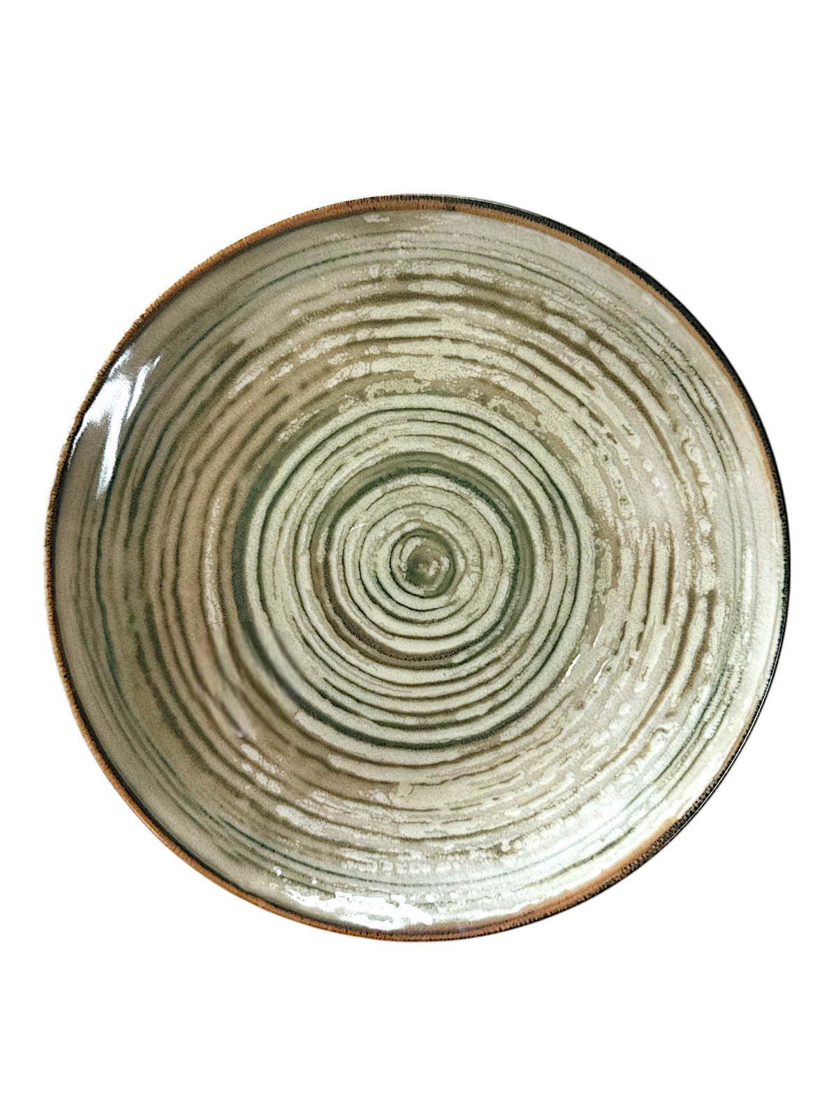 • Design: Textură în cercuri concentrice, glazură lucioasă, cu variații naturale de tonuri verzi și bej – fiecare farfurie este unică.