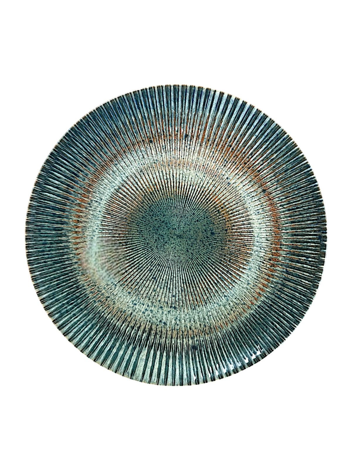Inspirată din dinamica razelor solare și texturile organice ale ceramicii japoneze, farfuria Hera Solaris aduce o notă vibrantă și sofisticată oricărei mese. Cu un diametru de 25.5 cm, această piesă impresionează prin finisajul său radial, ce pare sculptat manual, și prin nuanțele intense de verde-albăstrui, rugină și crem, care variază subtil în lumină.