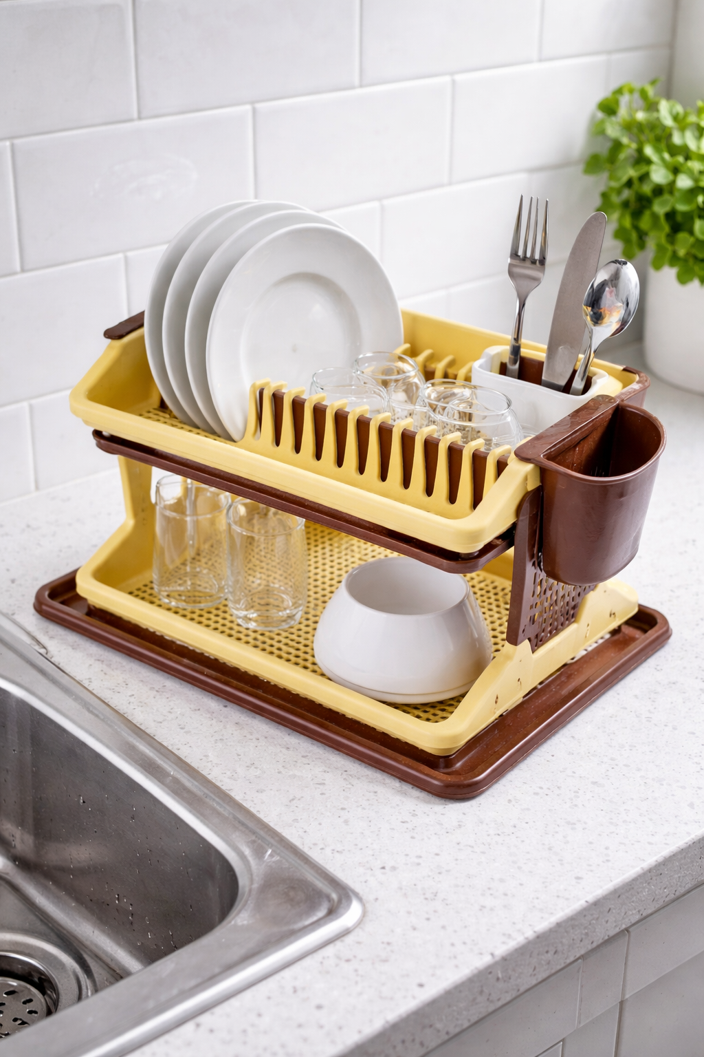 Structura etajată oferă loc special pentru farfurii, pahare, boluri și ustensile de bucătărie, facilitând scurgerea apei și uscarea rapidă a acestora. În același timp, designul său compact îl face ideal pentru bucătăriile moderne, unde fiecare spațiu trebuie folosit eficient.