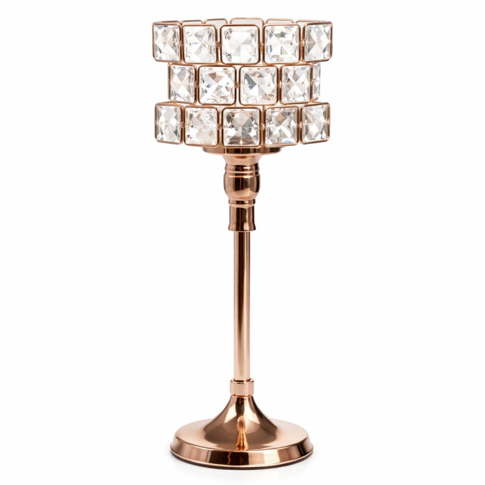 Partea superioară este decorată cu pietre din sticlă fațetată, dispuse într-un model geometric elegant, care oferă un aspect luxos și rafinat. Tija metalică subțire și baza stabilă completează designul, asigurând atât rezistență, cât și un aspect decorativ deosebit.