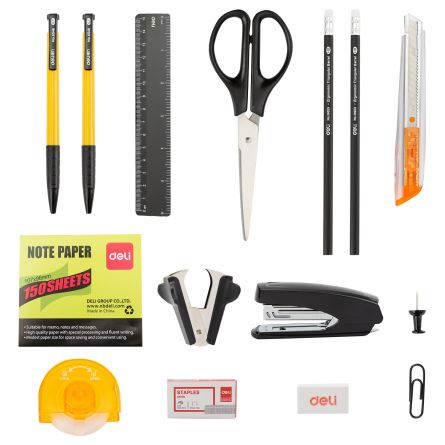 Setul contine: agrafe pentru hartie (20 buc), pioneze (10 buc), radiera, 2 creioane HB, foarfeca, cutter mic, rigla de 15 cm, capsator nr. 10, decapsator, o cutie de capse nr. 10, 2 pixuri cu mina neagra de 0.07 mm, dispenser de banda adeziva pentru banda de 18 mm si un notepad cu 150 de coli.