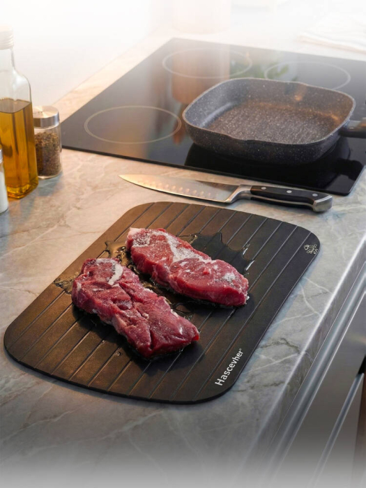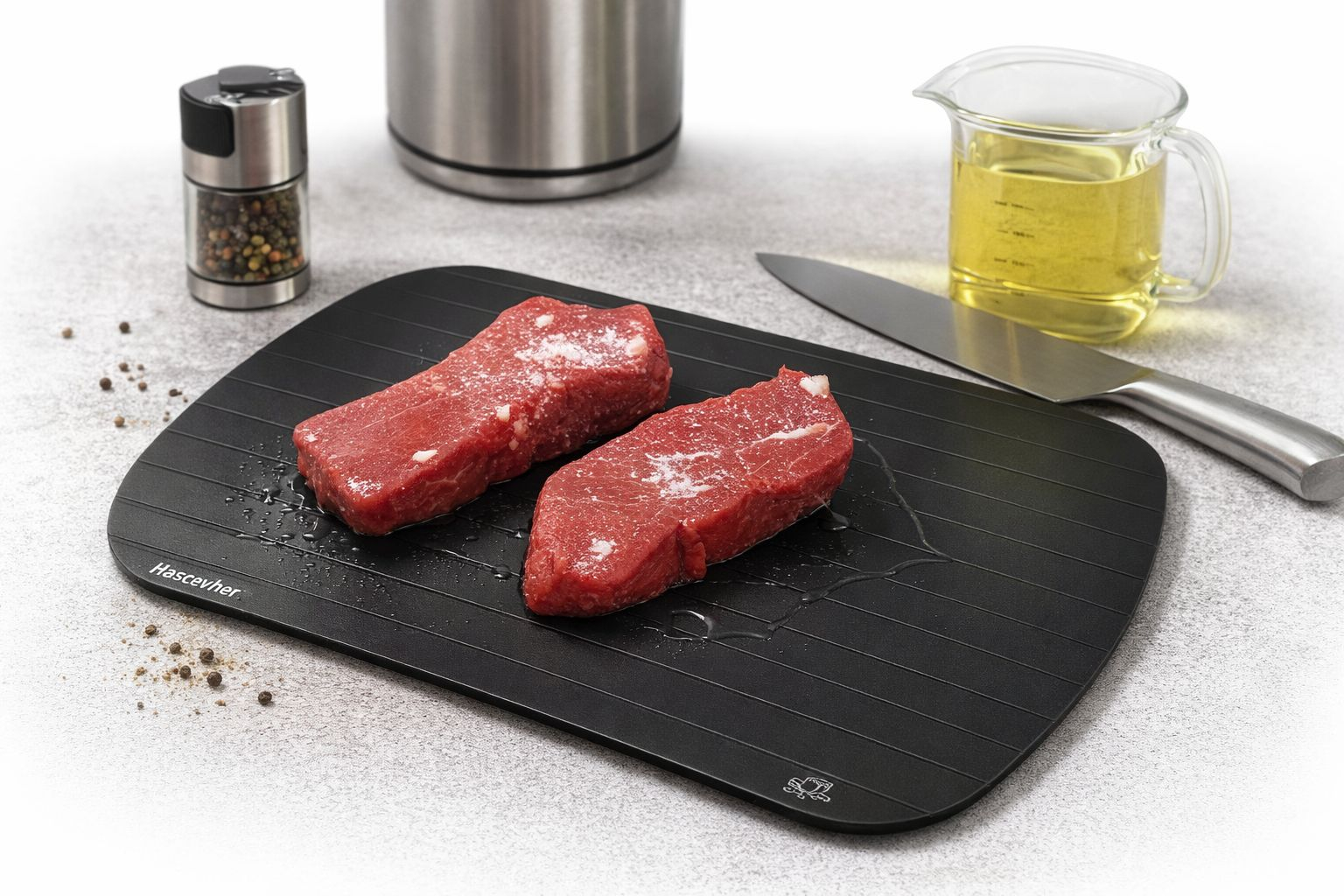 Tava de dezghețare Hascevher este un accesoriu de bucătărie inovator, conceput pentru a dezgheța rapid și natural alimentele congelate, fără utilizarea electricității, a apei calde sau a cuptorului cu microunde. Datorită materialului special cu conductivitate termică ridicată, procesul de dezghețare este accelerat în mod eficient, păstrând gustul și textura naturală a alimentelor.