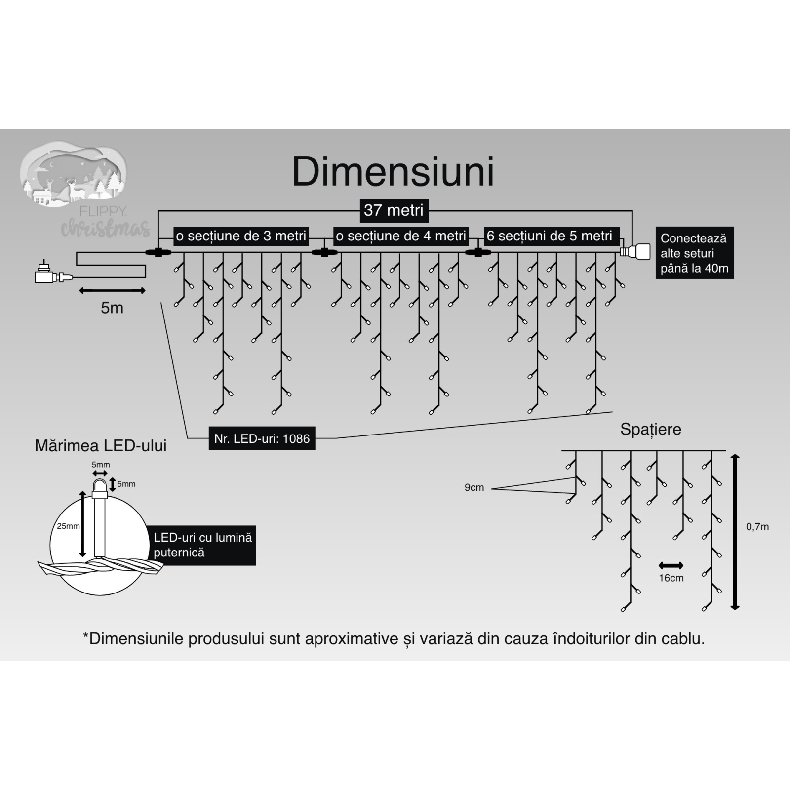 Suprafata luminoasa are un total de 37 m metri. Lungimea prelungitorului este de 5 m metri. Ofera posibilitatea de a suspenda ghirlanda astfel incat sa poata fi ascuns cablul de alimentare atunci cand este conectat la priza.