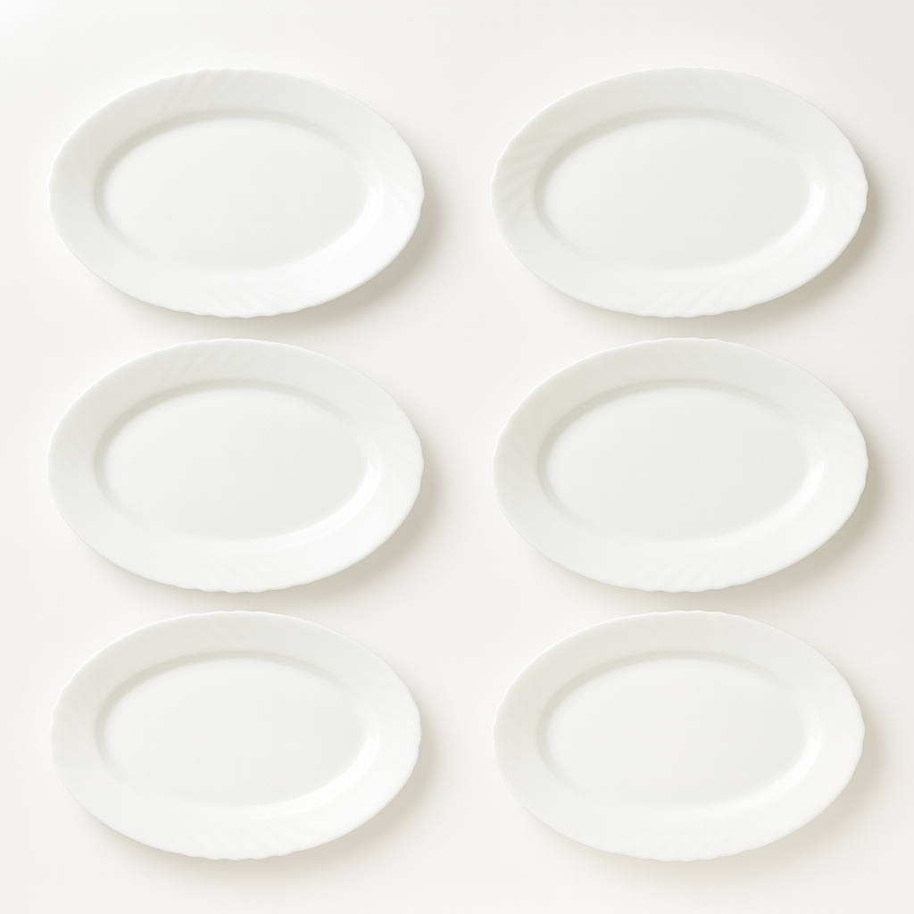 Adaugă eleganță și funcționalitate servirii meselor cu platoul oval din opal alb, 35 cm, disponibil într-un set practic de 6 bucăți. Realizat din sticlă opal de calitate superioară, acest platou îmbină rezistența cu rafinamentul, fiind ideal atât pentru utilizarea zilnică, cât și pentru ocazii festive.